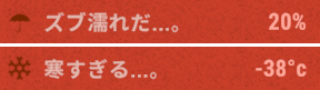 一番暖かい昼の11時~15時の間で「寒すぎる…。」の表示を消せる防寒は34%です。雪が激しく降りズブ濡れ20%となった場合は防寒48%で「寒すぎる…。」の表示を消すことができます。