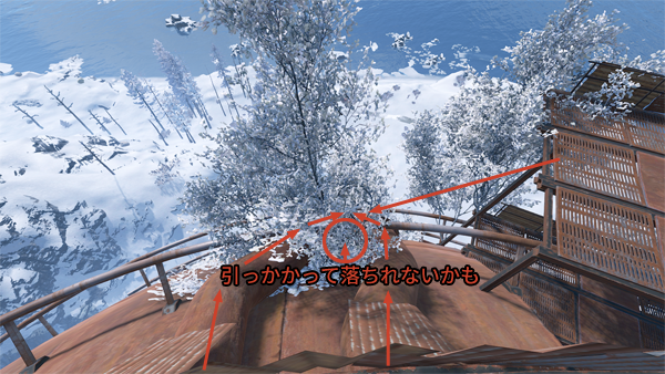 まず屋上からディーゼル燃料があった場所のちょうど真反対辺り、屋上へとやってきた入口近くから滑り落ちていきます。途中にある棒部分に落ちるようにすればダメージは喰らいません。