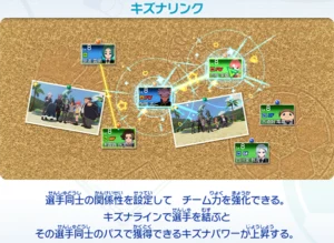 キズナリンクでキャラクター同士をキズナラインで結ぶと、青色の線で結ばれます。この青色の線で繋がっているキャラクター同士でパスが成功すると、キズナパワーの上昇量が「+1%」されます。つまり1回のパスでキズナパワーが2%貯まるようになります。