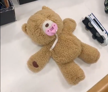 おもちゃコーナーで恐ろしい熊を発見!?おしゃぶりを外すと目が……