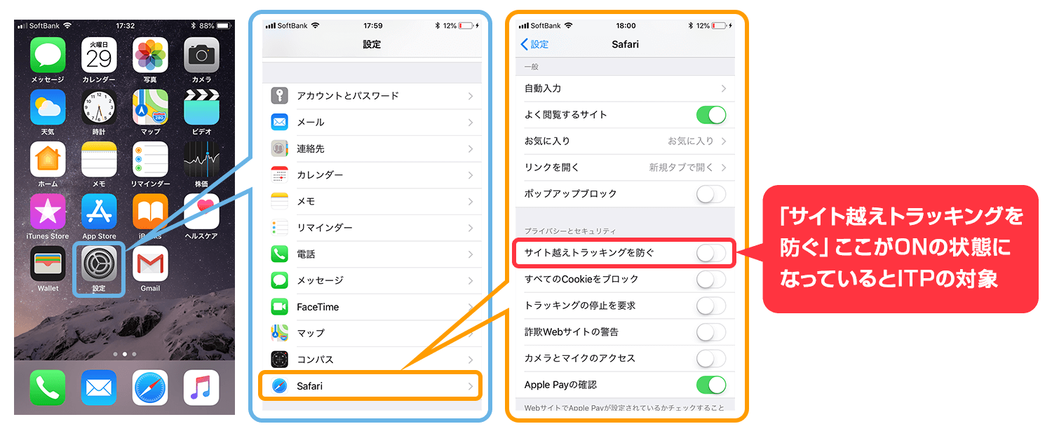 「設定」>「Safari」>「サイトトラッキングを防ぐ」《OFF》に設定