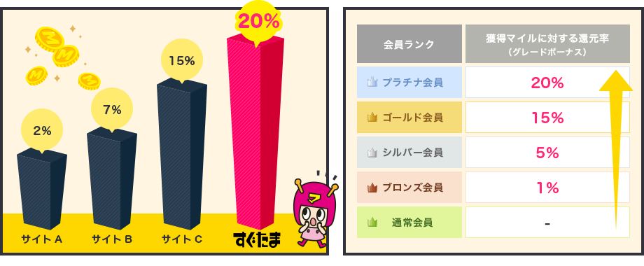 すぐたまは過去6ヶ月間のサービス利用状況に応じて会員ランクが上がり、獲得するポイントにボーナスが付きます。最高ランクのプラチナ会員なら20%ものボーナスを得ることができます。